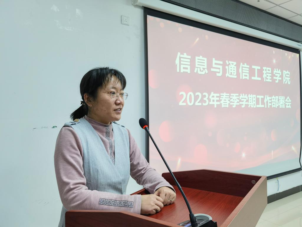 教学科长梁俊芳传达学校对新学期课堂教学、教改项目申报、学科竞赛和工程教育认证等工作要求;同时要求教师严格遵守上课时间,按要求提交本学期教学日历,配合完成学生补考等工作。