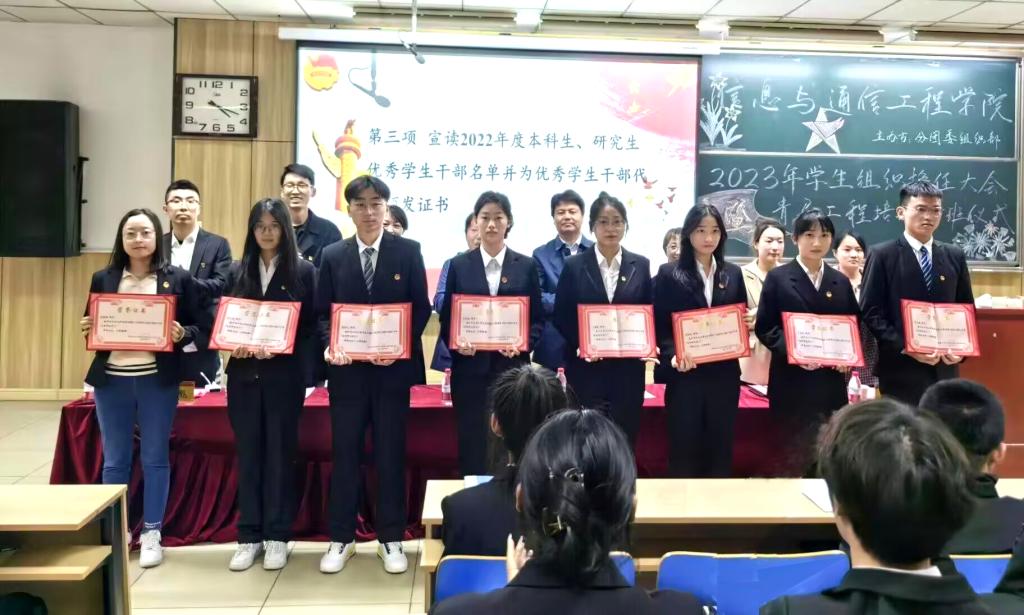 2023年度学生组织换任大会暨青马工程培训开班仪式在09102H教室成功举办。学院党委书记曹凤才、党委副书记兼副院长魏媛媛、团委书记闫婷、学生科张永玲老师、王秋惠老师、孟伟老师、王欣老师及本科生、研究生全体学生骨干及青马学员出席大会。会议由院团委王彪老师主持。