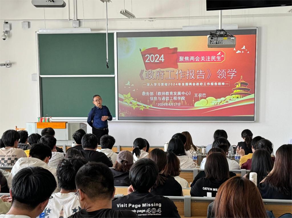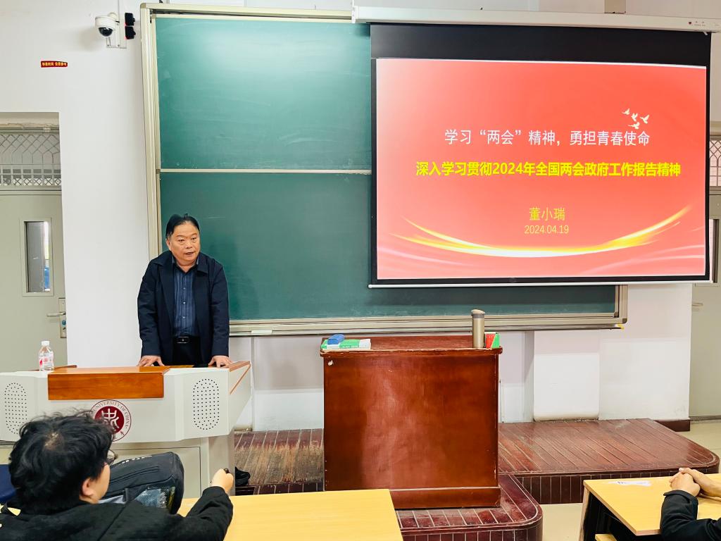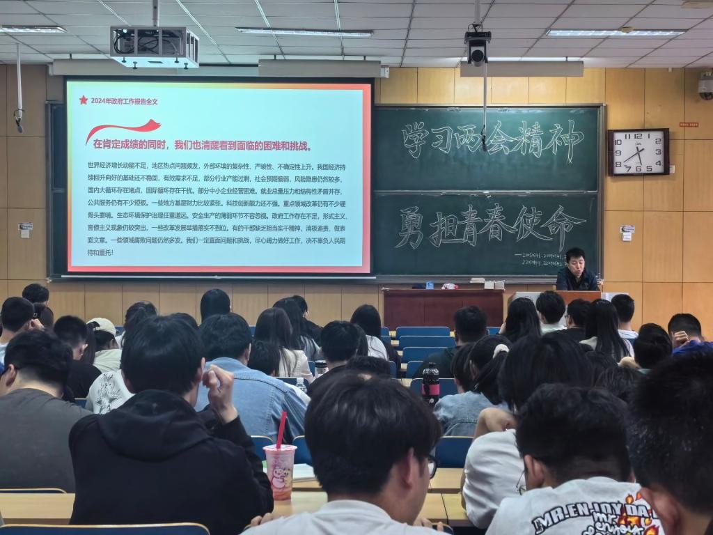 马东旭副部长深刻分析了国际国内局势,就政府报告中“加快发展新质生产力、加强科技创新、全面提升新兴领域战略能力”等做出了详细解读,引导学生积极关注祖国的建设成就,时刻关心国家发展大事,提高个人的思想觉悟,树立信心,学会担当,努力奋进,不负春光韶华,厚植家国情怀,成为立大志、担大任、明大德、成大才的时代新人。