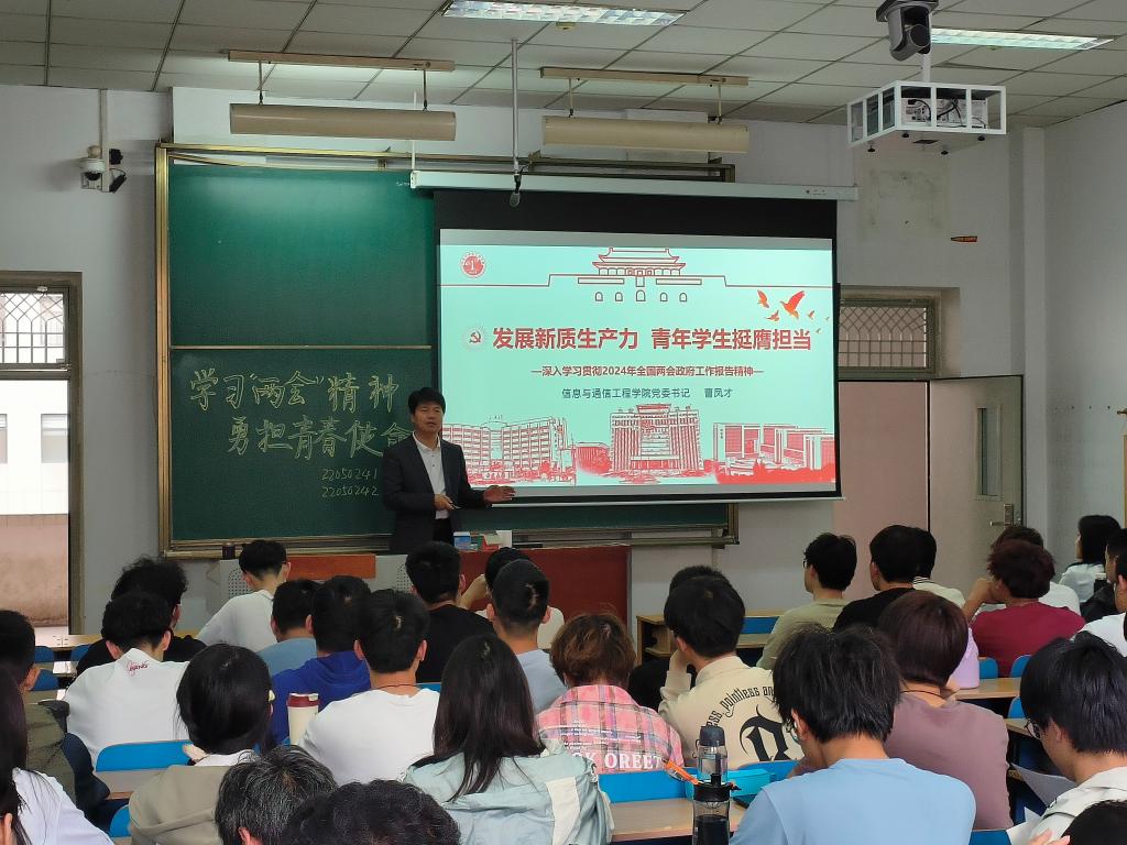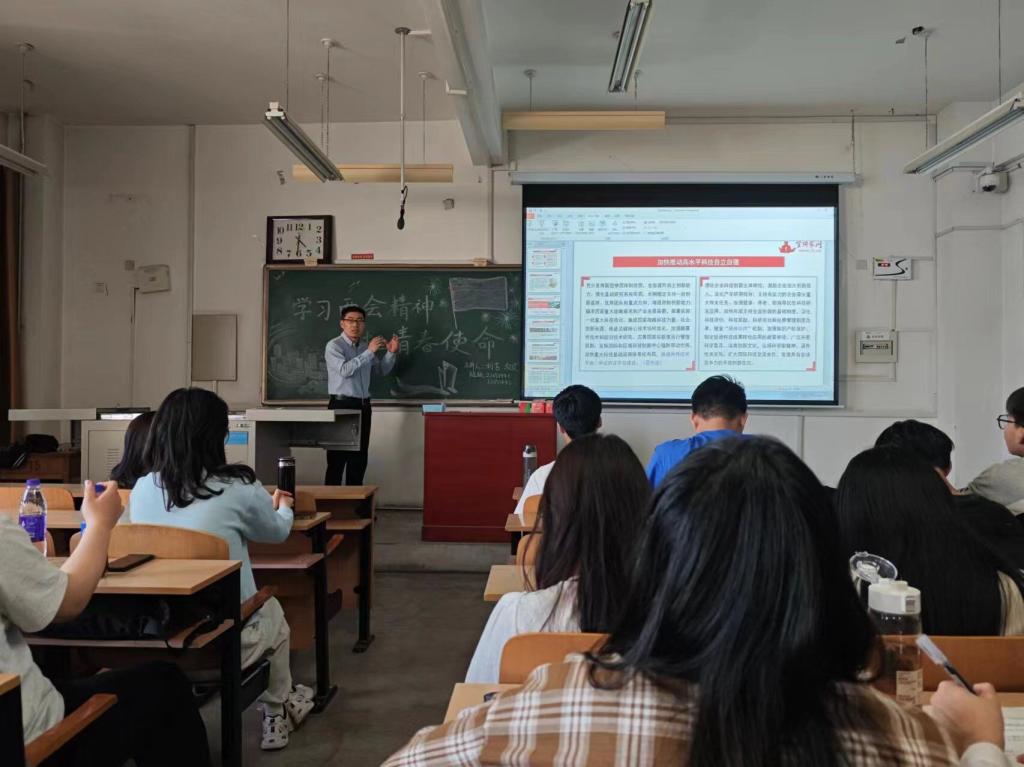 学院党委书记曹凤才围绕“学习‘两会’精神,把握发展新质生产力的内涵要义”展开分享,为同学们剖析了“新质生产力”这一两会热词,启发引导同学们关注“两会”,观察生活,扎实专业理论基础,投身科技革命创新。