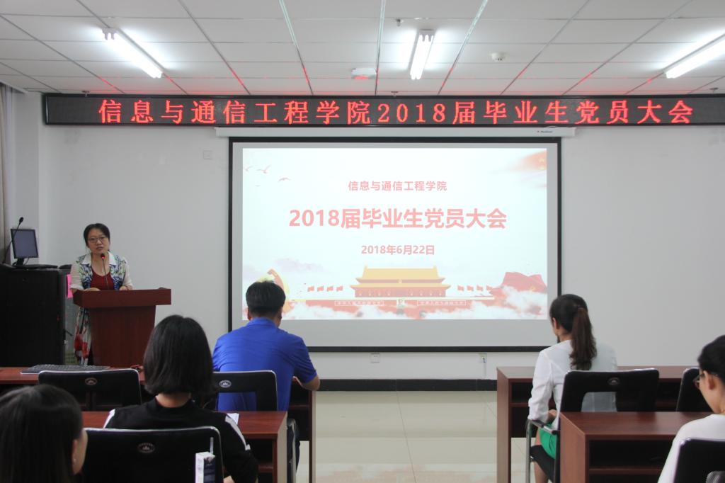 6月22日上午10时,信息与通信工程学院2018届毕业生党员大会在院楼715会议室顺利召开,本次毕业生党员大会以系列微党课的形式举行。院党委书记曹凤才、院长杨风暴、院党委副书记兼副院长魏媛媛、各学生党支部书记、全体2018届毕业生党员参加了本次大会,会议由院学生科科长任雁主持。