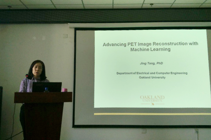在报告中Jing Tang教授重点介绍了如何利用稀疏表示作为先验信息进行正电子发射断层成像(PET),同时也讲解了深度学习方法在PET及其他医学影像技术的发展前景,使参加讲座的师生受益匪浅。报告结束时师生们踊跃提问,Jing Tang教授进行了耐心的解答和讨论。