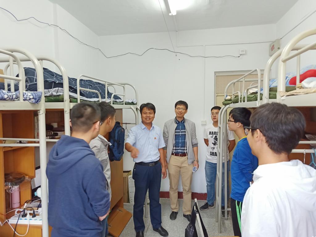学生公寓慰问2018级新生。学院党委书记曹凤才、院长杨风暴、党委副书记兼副院长魏媛媛、电工电子实验中心副主任郎文杰、各学科管理部主任和副主任、2018级新生班主任也共同来到宿舍进行走访慰问,为新生们带来了温暖,解答了困惑。