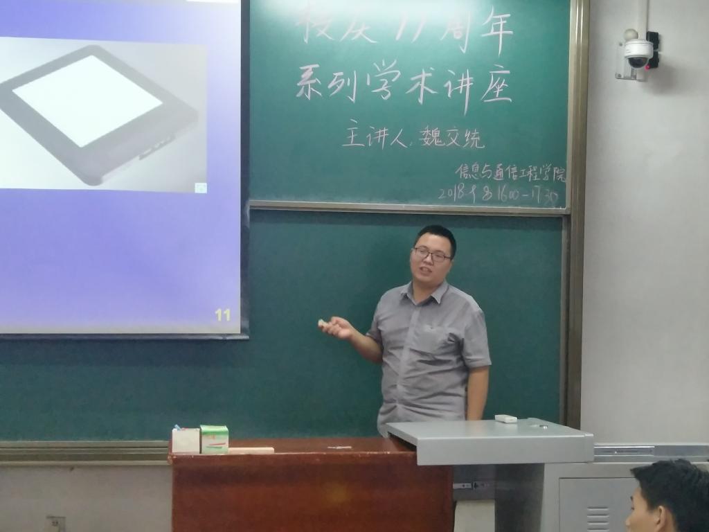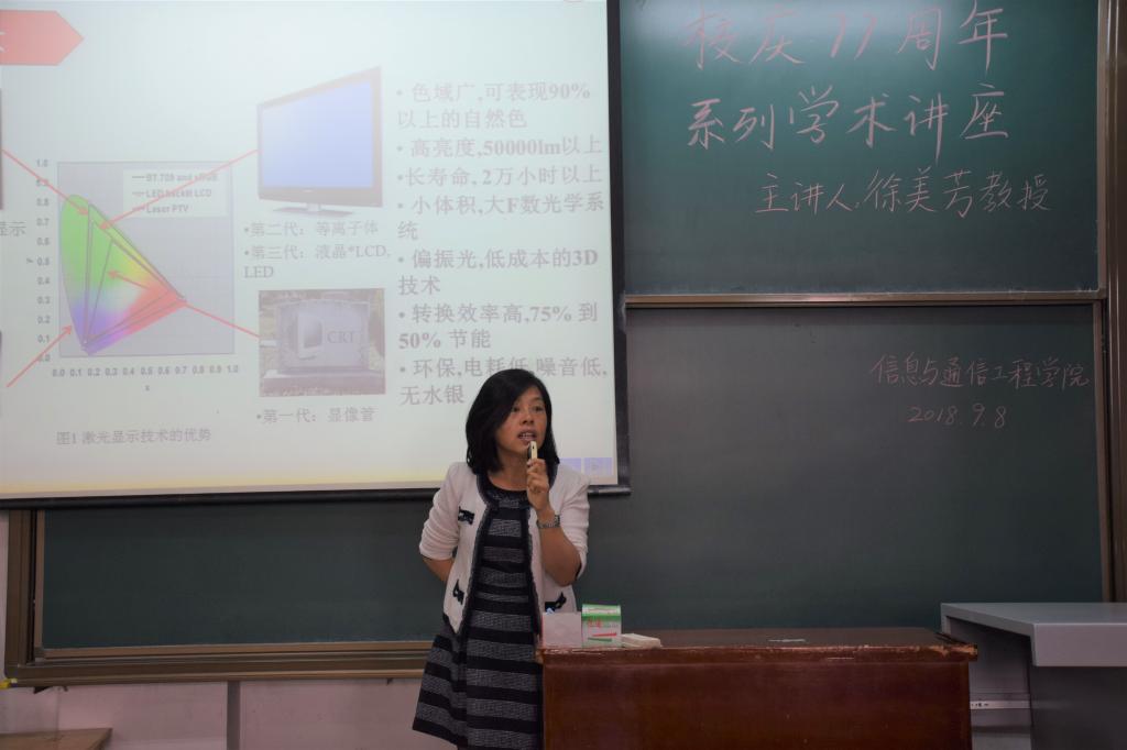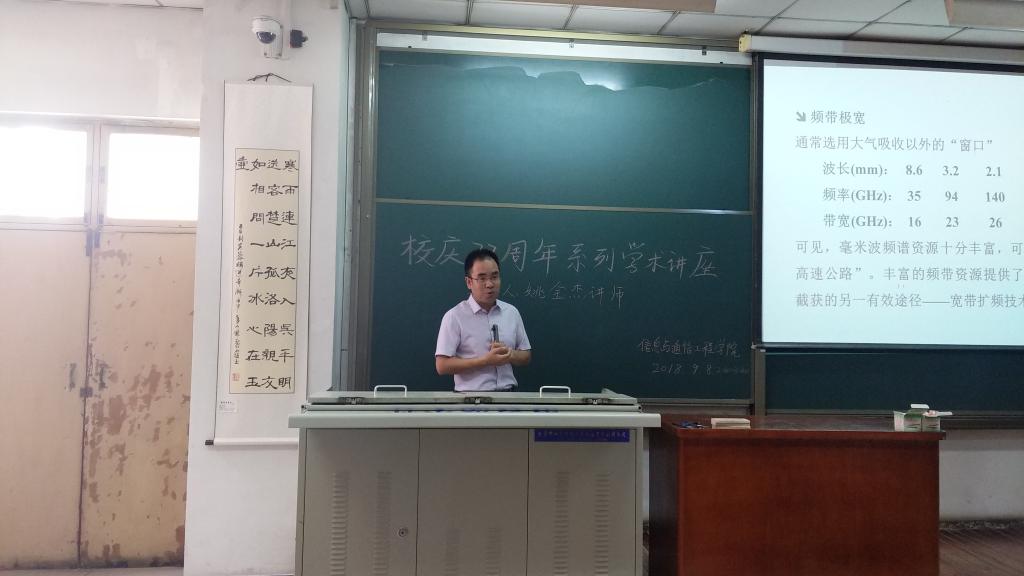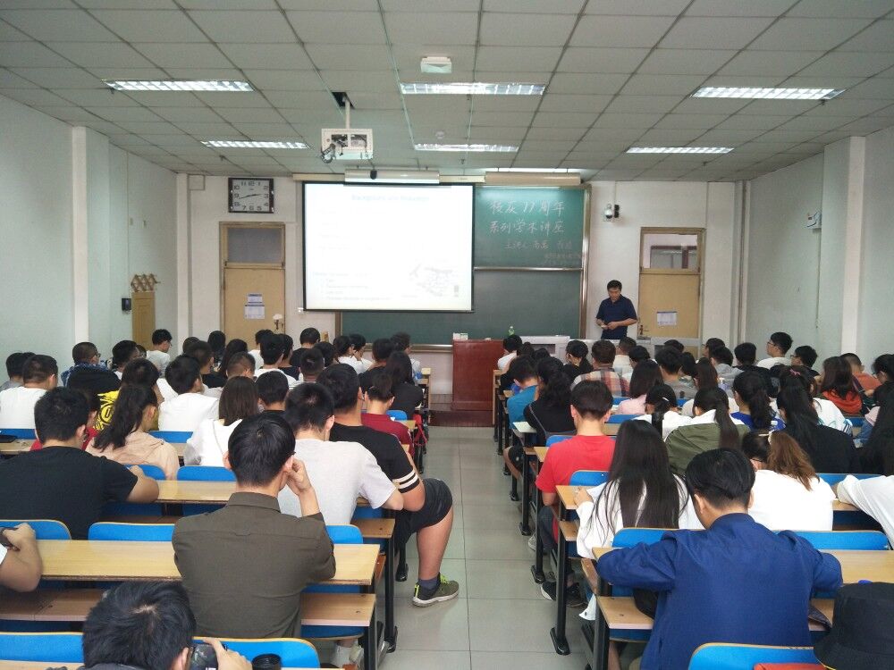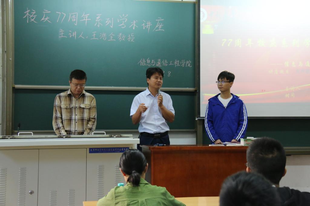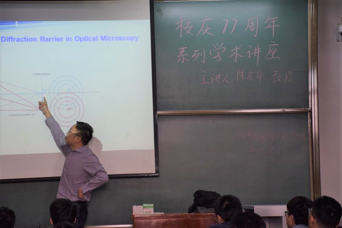 上午8:30,在11105H、11106H、11107H教室的三场学术讲座拉开了校庆系列学术讲座的帷幕。曹凤才书记首先致辞,他回顾了我校77年来的发展历程,展望了我校百年百强的发展方向。接着,王浩全教授围绕《超声成像检测方法的研究与趋势》,介绍了一种新型的无损无创生物医学影像技术——光声层析成像技术;徐美芳副教授结合自身实践经验和研究成果,就《激光投影显示中散斑抑制方法研究》课题做了分享;鲁旭涛副教授以《数字化可回收垃圾分类回收系统及装备的研发生产》为题,给同学们介绍了垃圾的污染情况及回收机的总体设计和发展前景;刘吉副教授就《激光散斑成像技术及应用》的课题,讲解了光场成像和弹丸速度测量的方法;陈友华副教授以《生物荧光超分辨显微成像技术发展历史及趋势》为题,用巧妙的例子引出显微镜的原理与技术发展,激起同学们的兴趣;李凯副教授以《磁场探测与应用技术》为主题,带着同学们走进神秘的“磁”,围绕地球磁场、电磁无损检测等技术给同学们上了生动的一课;姚金杰老师围绕《毫米波技术及应用》,讲解了毫米波通信、毫米波雷达;尚禹教授以《近红外漫射光血流测量/成像技术及其临床应用》为题,从细胞到个体,让同学们了解了生物技术方面的知识;刘祎老师带着同学们走进了《低剂量CT成像技术》的世界,全程用全英文的PPT进行讲解,鼓励大家为我国的医疗事业发展尽自己的一份力;李剑副教授以《基于震动传感器阵列的盲空间微震定位方法》为研究对象,深入浅出地分析了震动传感器定位相关的特点;魏交统老师带领大家发现了《多能谱X射线成像技术研究》的神奇之处,激发了同学们浓厚的求知欲;马亚云老师以《光通信波段全固态连续单频激光器研究》为题,介绍了激光的产生及激光器的构造和应用。12位优秀教师分别围绕各自的研究领域,带来了一场又一场知识的饕餮盛宴。老师与同学耐心交流,并鼓励同学们结合自己的兴趣进行深入的研究。