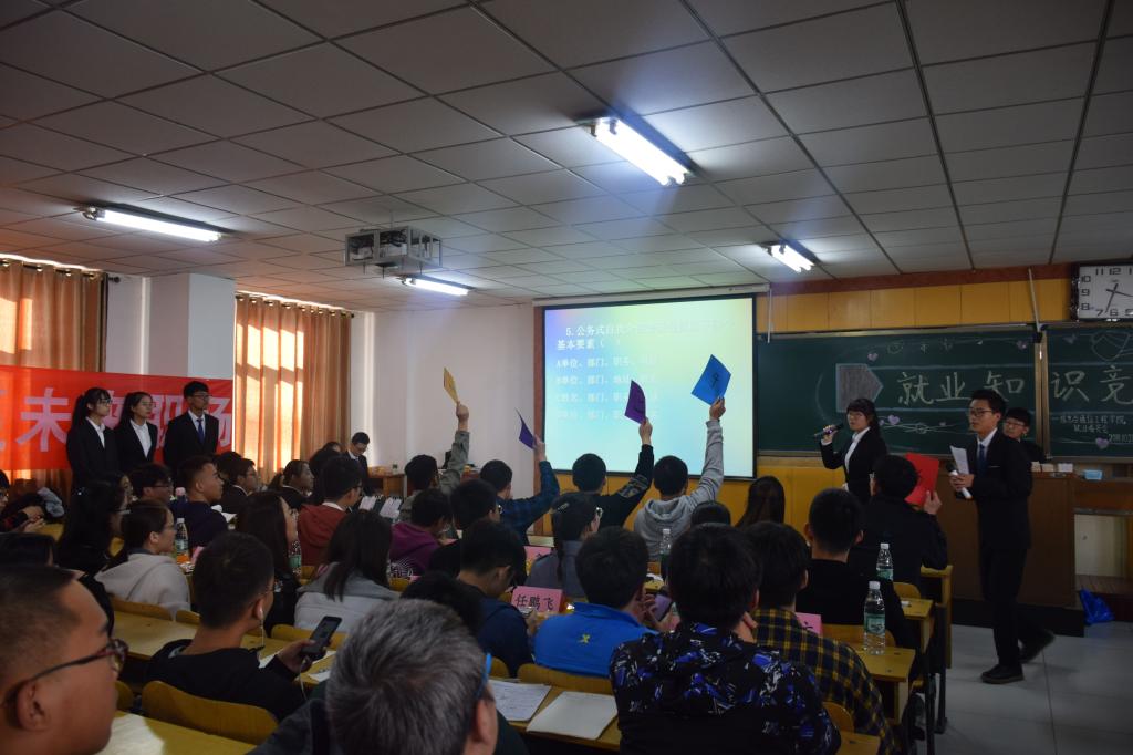 举办的就业知识竞赛决赛在06402教室顺利进行,此次就业知识竞赛在全院营造了良好的学习氛围,进一步加深了在校生对就业知识的认识和理解,有助于提高同学们对就业政策的应用能力,从而提升就业能力。