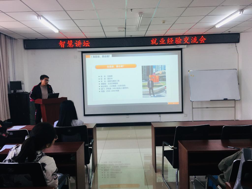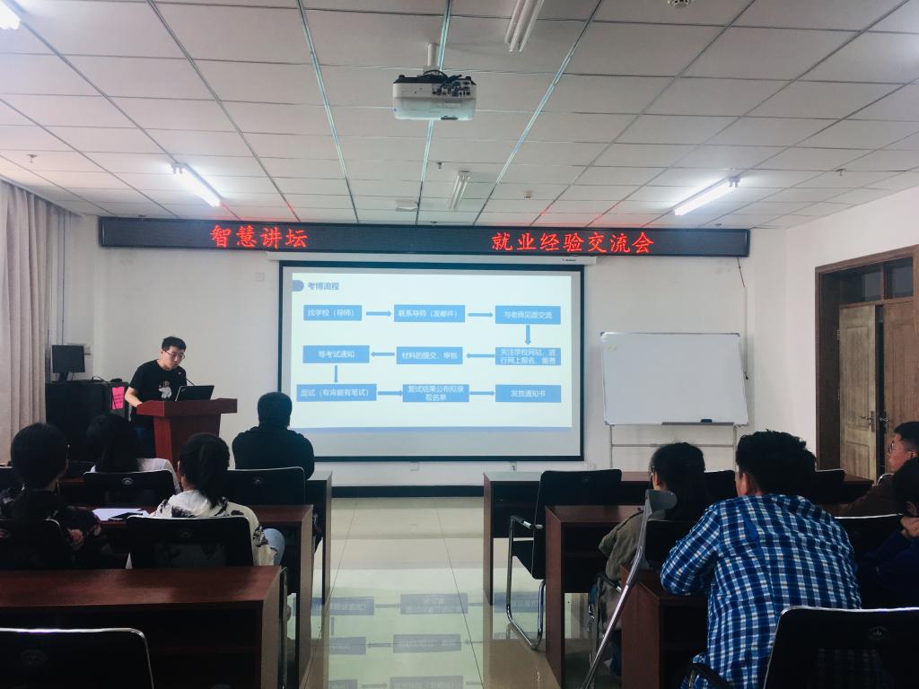 17级全体研究生在院楼715学术报告厅参加“智慧讲坛”暨2019届毕业生就业经验交流会。本次交流会的主讲人为即将入职工作以及读博深造的四位优秀毕业学子,他们介绍了关于自身定位、职业规划、行业选择、职位选择、简历制作、笔试面试等方面的经验,为即将面临求职或继续读博深造的17级研究生提供了宝贵的经验,对于以后的职业生涯规划提供了极具价值的信息分享。