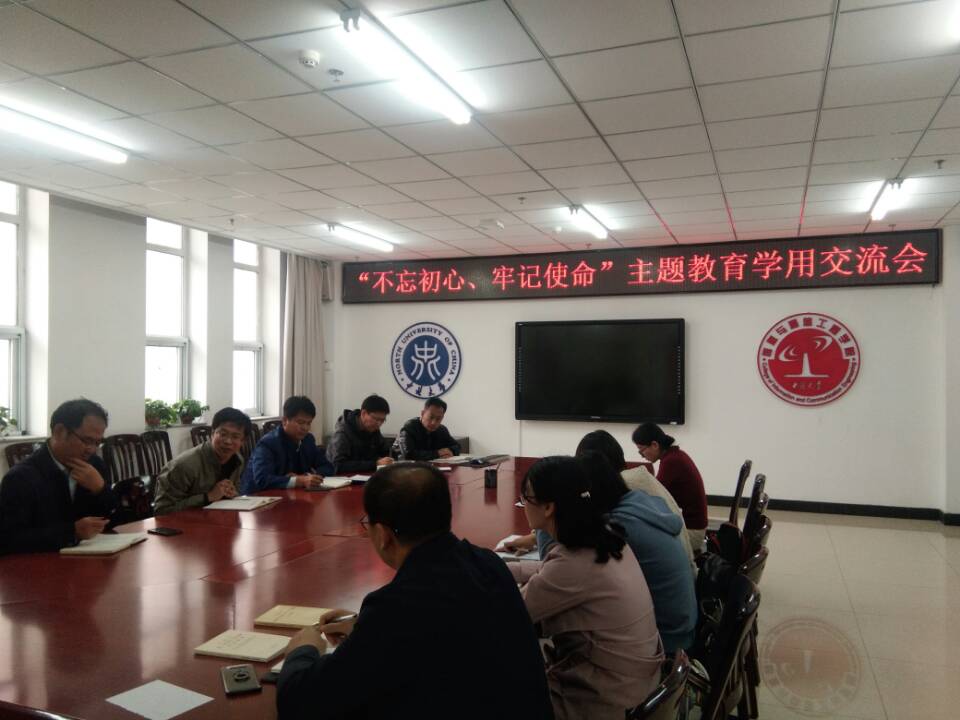 首先,院长杨风暴同志结合“不忘初心、牢记使命”主题教育的总要求,强调各项学习活动要紧扣学习贯彻习近平新时代中国特色社会主义思想这一主线,牢牢把握 “守初心、担使命,找差距、抓落实”的总要求,将主题教育活动与学院的学科建设、教学工作、工程认证和学生工作等中心工作结合起来,倡导大家在开展各项工作时能坚持原则,按规矩办事,守住初心;能团结合作,勇于奉献,承担使命;并能提高本领,结合实际,学用结合。