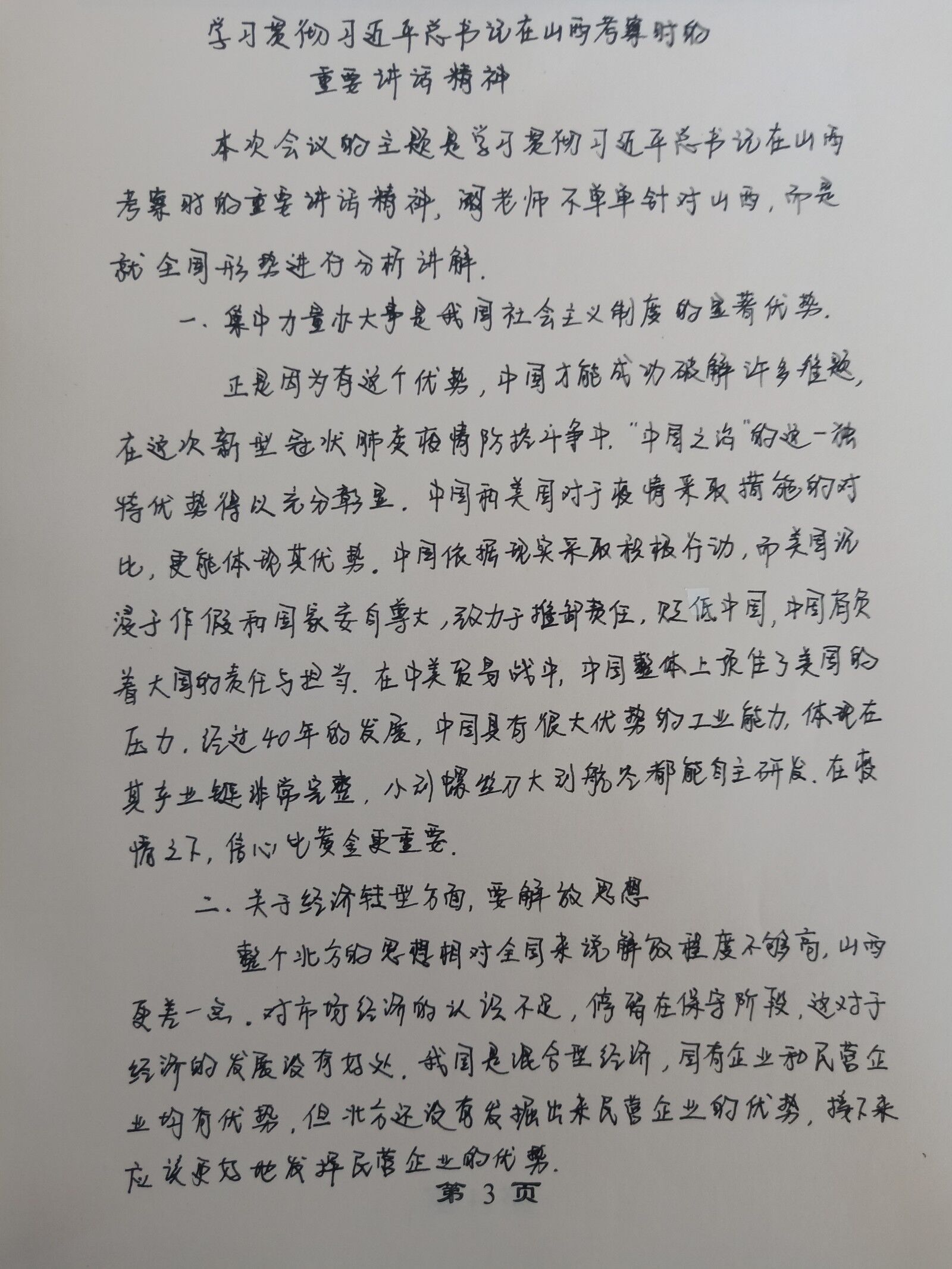 随后,阚老师讲到山西的发展在全国大背景下的机遇和挑战;民营企业在我国混合制经济体制中的重要作用;阿里巴巴、华为等大型企业在疫情中的贡献;太原基础设施的建设和人民生活质量的改善等,让大家对山西经济的发展充满信心。习近平总书记指出山西要以创新驱动推动经济转型发展,以营造良好环境推动经济转型发展,可谓是对山西经济发展的精准把脉。我们必须始终坚持以习近平总书记重要讲话精神为指导,才能使山西在新征程上迈出新步伐。