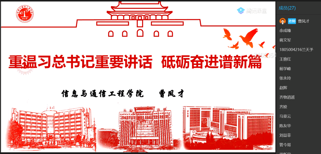 领学活动中,党委委员们以“重温习近平总书记重要讲话,砥砺奋进谱新篇”为主题,带领全院全体师生党员重温了习近平总书记视察山西的足迹和讲话,并结合自身感受习近平总书记重要讲话精神对我们工作、学习、实践的指导作用。通过领学,学院师生党员对习近平总书记视察山西的讲话精神和重要指示有了更深、更细的认识和理解,深刻体会到习近平总书记对山西的关心和关怀,为深刻学习领会习近平总书记重要讲话重要指示提供了科学的学习方法。党委委员们要求学院党员师生要牢记总书记的殷殷嘱托,坚持不懈抓好党内政治生态建设,加强理想信念教育,并要求全体党员同志发挥先锋模范作用,抓住省委支持学校率先发展的机遇,克服新冠肺炎疫情带来的不利影响,不忘初心,砥砺奋进,牢牢扛起攀登科学高峰的使命;牢牢扛起为转型发展提供科技支撑的使命,立足服务山西转型发展大局,着力科研成果转化和产业化,打造转型发展竞争新优势;牢牢扛起打造一流人才高地的使命,建设一流学科;牢牢扛起立德树人、培养人才大军的使命,立足山西、面向未来,深化教育教学改革,更好服务高质量转型发展。只争朝夕乘势而上,为实现我校双一流建设和百年百强的中北梦贡献自己的力量!