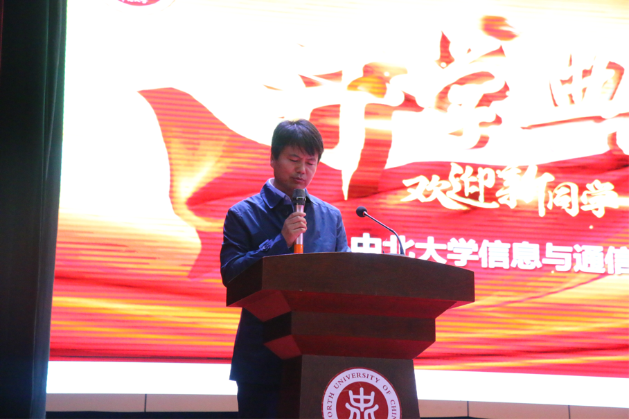 在庄严的国歌声中,大会拉开帷幕,全体师生肃穆而立,挺拔的身姿展现了信通学子昂扬向上、拼搏进取的精神风貌。学院院长杨风暴为新生做了学院的整体介绍,包括学院的历史沿革、师资力量、学科设置、以及教学科研等情况,鼓励学生在新的平台尽情展示自我才华,参与创新实践,希望全体新生能够仰望星空、脚踏实地、拼搏进取、超越自我!