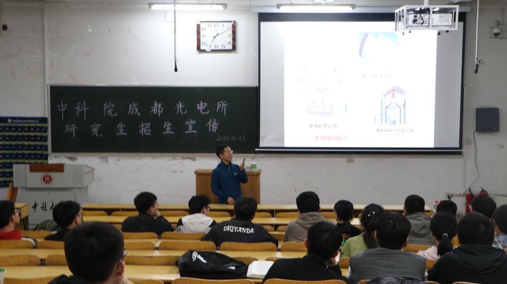 宣讲会,介绍了光电所的基本情况及研究生培养情况,重点讲解了研究所的基础设施和研究设备,在重大国家战略项目中做出的突出贡献。近年来,研究所在太空望远镜、量子通信望远镜、CE-4地形相貌相机等航天、通信国防领域取得了重大成就。