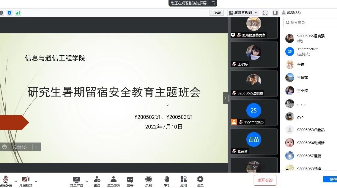 在主题班会上,各位班主任分别从人身安全、财产安全、网络安全、实验室安全以及疫情防控安全等方面对研究生进行了安全教育,要求同学们从思想上高度重视、提高警惕,要始终牢固树立“安全第一”的防范意识,以防止安全事故的发生。疫情当下,全体人员要减少不必要的出行,不前往中高风险地区,如有确需外出的情况应严格遵守请销假制度并做好个人防护。在校期间,要遵守实验室、宿舍、其它场所的安全管理规定。同时,班主任提醒同学们要注意电信网络诈骗,不轻信来历不明的电话或者手机短信,不因贪图小利而受不法分子诱惑,绝不向陌生人汇款,不点击陌生链接,杜绝网络和电话诈骗。最后,班主任还提醒同学们要利用暑假时间做好自己的科研工作,不断提高自己的创新能力。