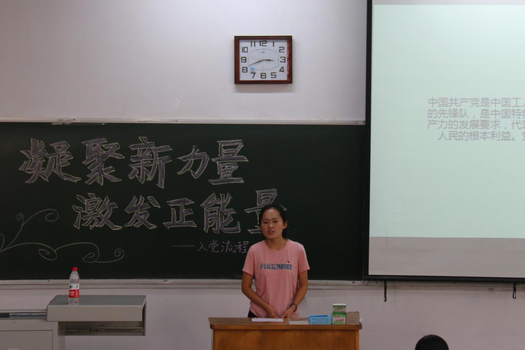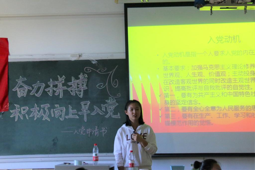 本次主题教育活动分为五个部分:1、“党在我心中,永远跟党走”;2、“凝聚新力量,激发正能量”;3、“讲中国故事,做时代新人”;4、“点亮青春之灯,奉献成就人生”;5、“奋力拼搏争先锋,积极向上早入党”,各支部副书记从党团知识到党员的权利与义务、从入党动机到入党流程,以及入党申请书相关材料的书写等方面给新生进行了详细而生动的讲解,相信每一位同学都能在此次培训中有所收获,使自己的思想受到洗礼,激发向党组织靠拢的热情,争取早日成为一名共产党员。