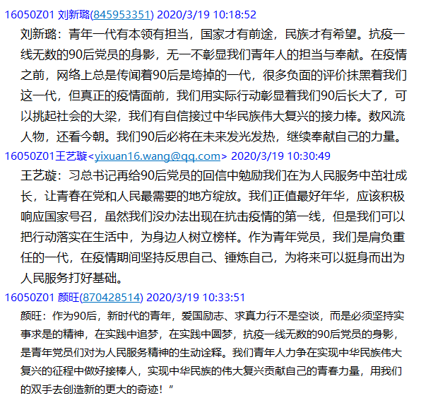 有的党员在群里发表感言:你救了我的命,我却连你的样子都未曾真正见过,这些可爱的人付出的背后,我看到了他们全心全意为病人服务的初心和为百姓健康谋福祉的使命。影射于己,作为一名学生党员,我意识到了自己的诸多不足,也深切地明了只有努力学习科学文化知识,练就过硬的本领,才能在国家和人民需要我的时候不假思索地挺身而出”。