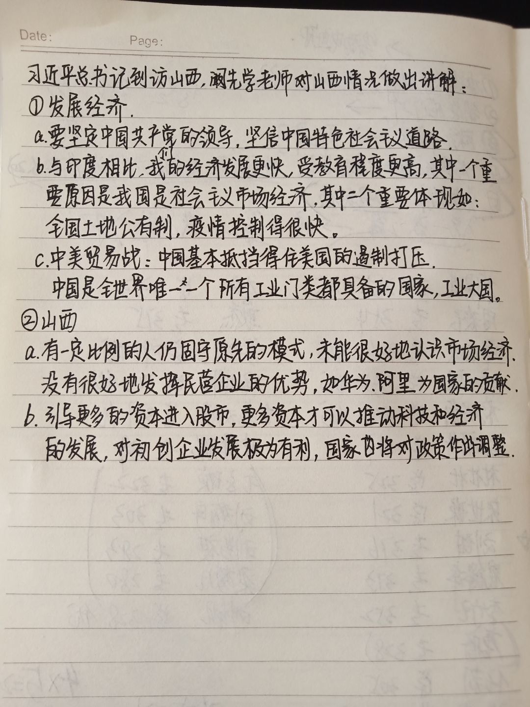 首先,阚老师以中印在教育、经济方面的对比;中美疫情防控措施和态度的对比;中美贸易战;通信基站建设等为例,客观形象地分析了中国发展速度如此之快的原因,关键因素是中国特色社会主义制度的优越性使我国率先走在了发展中国家的前列。习近平总书记在视察山西重要讲话中强调,新形势下要切实增强党内政治生活的政治性、时代性、原则性和战斗性。我们要按照习近平总书记的要求,紧紧抓住理想信念这个根本,增强“四个意识”、坚定“四个自信”,把讲政治贯穿于党性锻炼和开展工作全过程,坚决以习近平新时代中国特色社会主义思想为指引,坚定不移走中国特色社会主义道路。