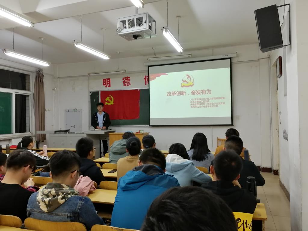 为了扎实推进改革创新,奋发有为”大讨论,2019年42下午麻豆a片 学生党支部在10206Z教室举办了我为改革创新做什么主题党日活动,会议光电信息科学与工程专业学生党支部副书记余成臻同志主持