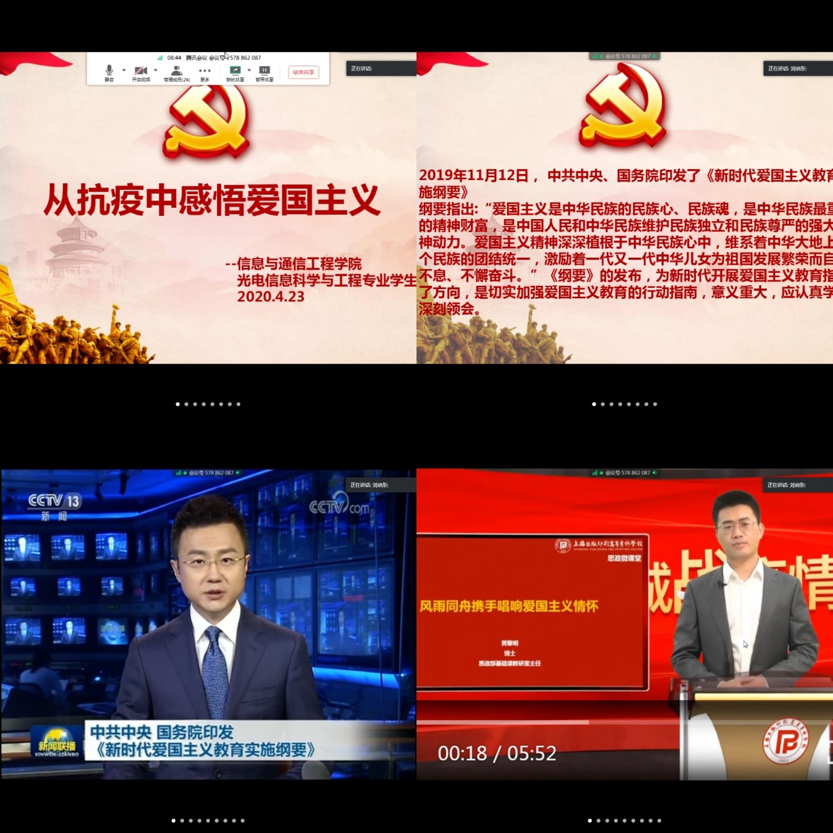 2020年4月23日星期四下午2:30-3:30,光电信息科学与工程党支部开展了“从抗疫中感悟爱国主义”主题的党日活动。本次活动由学生党支部副书记刘玥彤主持,参加本次党日活动的是光电信息科学与工程党支部学生党员。因特殊情况,本次活动通过腾讯会议线上开展。