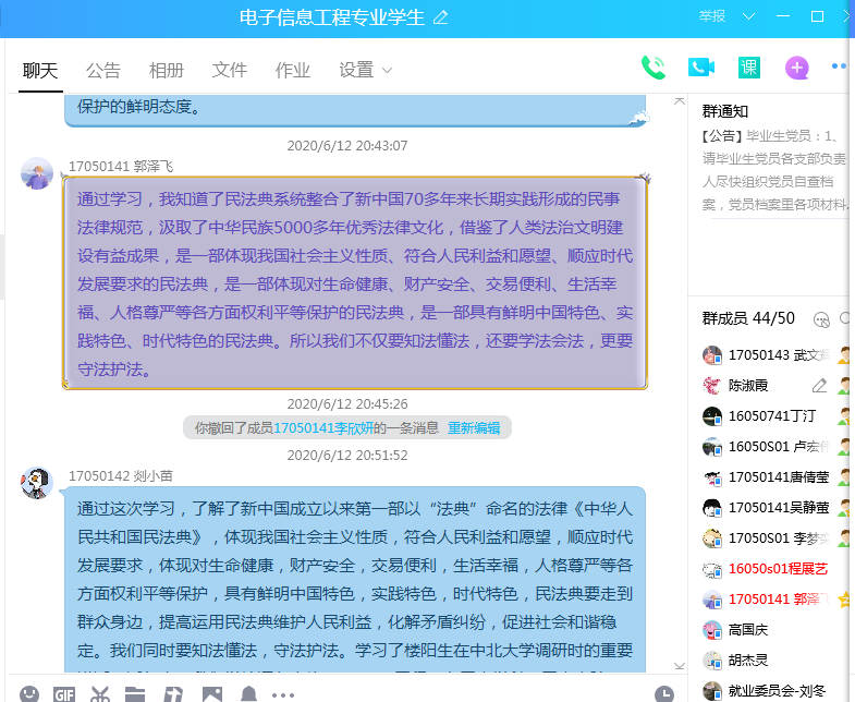 《民法典》的颁布,为实现“两个一百年”奋斗目标、实现中华民族伟大复兴的中国梦注入了强大法治力量。近日,电子信息工程工程专业学生党支部不同时间、不同地点,通过不同形式分组展开了对《民法典》学习和讨论。