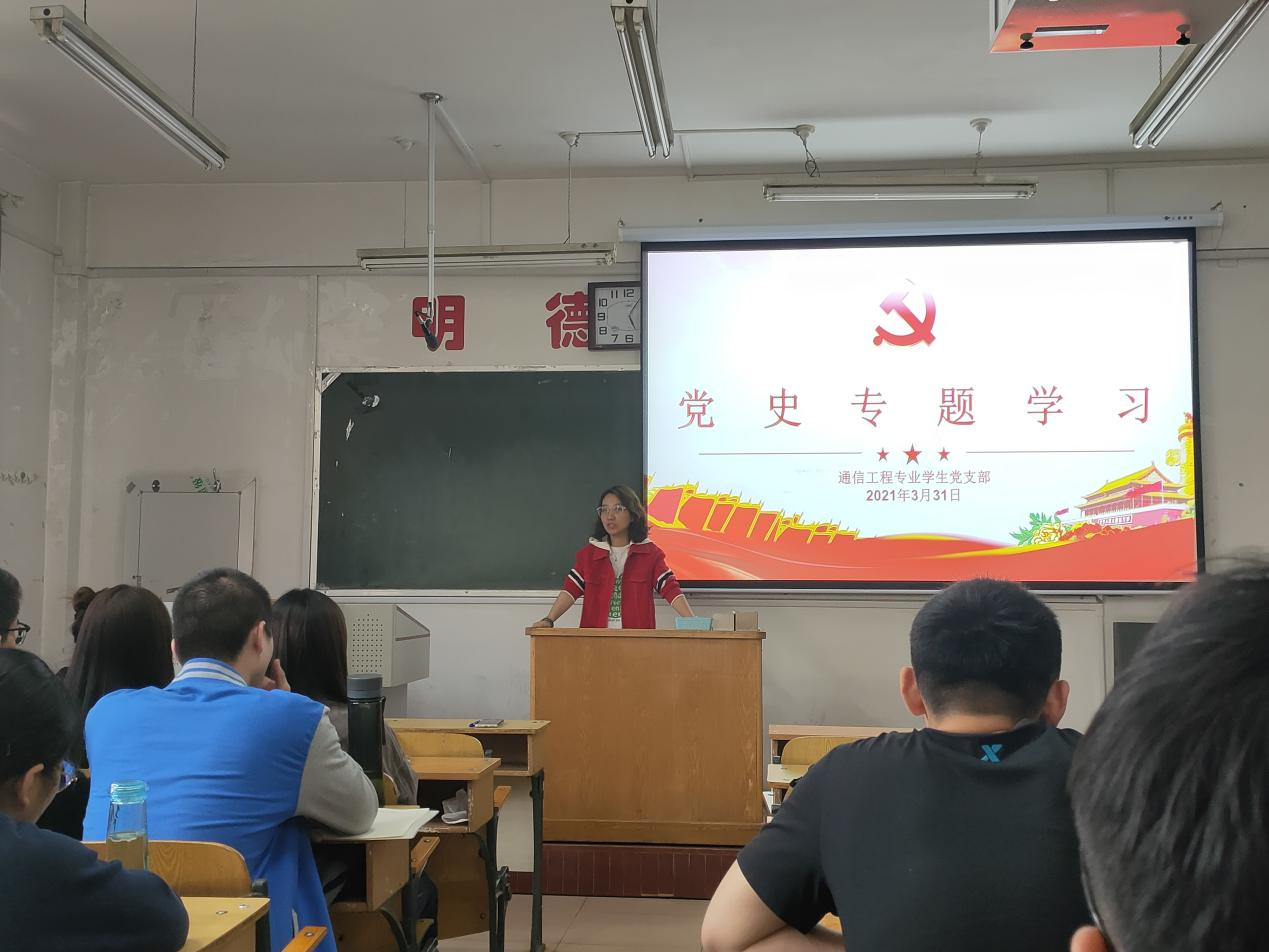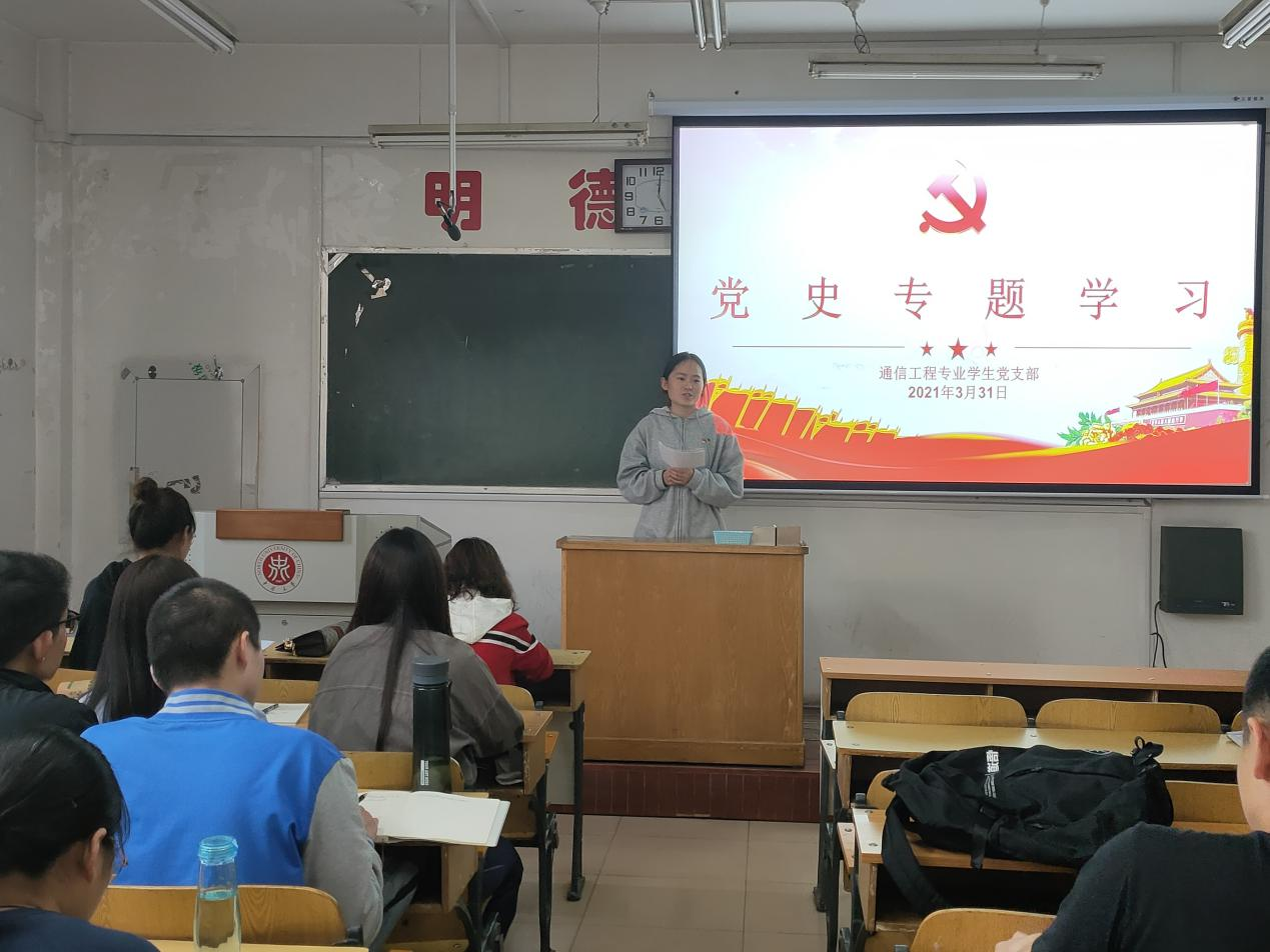 为切实抓好党员日常理论学习,响应中央党史学习领导小组《党史学习教育实施工作方案》以及省委《关于开展党史学习教育的实施方案》,2021年3月31日下午,通信工程学生党支部在闫婷同志的带领下,进行了党史专题学习。