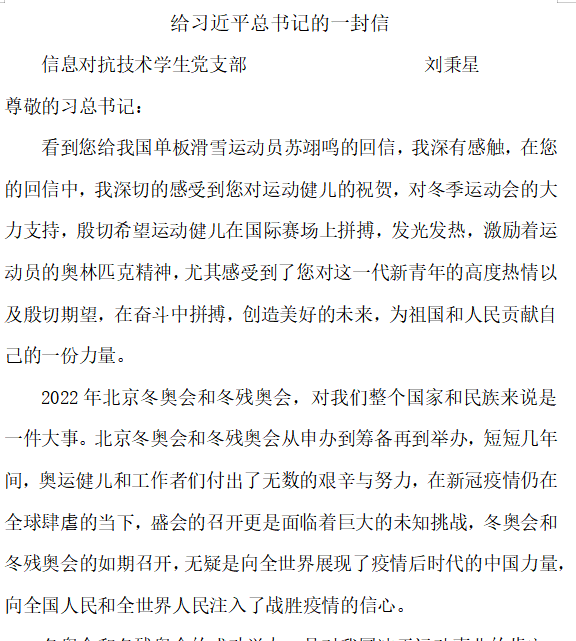 活动开始,我支部全体成员共同学习了有关习总书记给中国冰雪健儿重要回信精神,并在之后展开了讨论,领会了习总书记对广大青少年提出的期望和要求。更有同学表示“我一定会心系祖国、脚踏实地、久久为功、报效祖国,牢记教诲,勇攀高峰,日后努力在世界舞台上为祖国增光添彩”。之后,我们通过“给习近平总书记的一封信”的形式,将每位同学自身感受与心得融入信中。